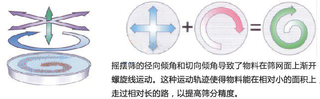 物料在圓形搖擺篩篩面上從中心到外圍擴散,物料均勻在篩面上做跳躍旋轉(zhuǎn)的螺旋運動,無法篩分到下層的物料會在該層面的出料口排出,直至所有物料篩分完畢。工作任務結束。